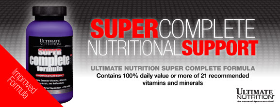 This formula contains 100% or more of 21 recommended vitamins and minerals. A powerful blend of antioxidants help protect cells against potential damage from free radicals including beta carotenes, lutein, zeaxanthine, rutin, hesperidin, and several other bioflavonoids. Amino acids, such as Glutamic Acid and PABA (para-amino benzoic acid), and precursors of amino acids, such as betaine hydrochloride ensure metabolism remains active. The most important B-vitamins in addition to Vitamins C, D and E help boost the immune system and maintain optimal health. Important minerals such as calcium and magnesium are required for absorption of amino acids and other nutrients in the body to maintain optimal metabolic function. Ultimate Nutrition’s Super Complete was rated 10
